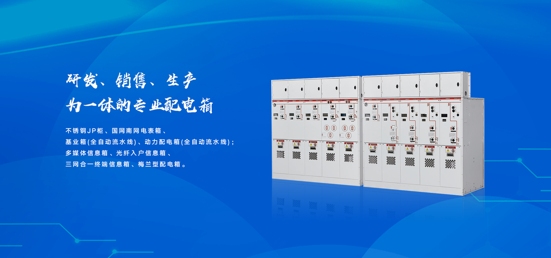 公司的核心產品為不銹鋼JP柜、國網南網電表箱、基業箱(全自動流水線)、動力配電箱(全自動流水線)、多媒體信息箱、光纖入戶信息箱、三網合一終端信息箱、梅蘭型配電箱、等電位端子箱和非標定制箱等;現于多家知名品牌,房產公司、電力公司、成套廠家深度合作,并贏得了合作方和終端用戶的一致好評!